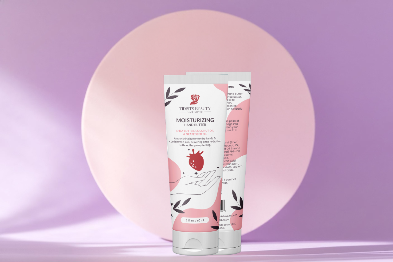 Tidbits Beauty Moisturizing Hand Butter deeply hydrates and nourishes dry hands with Shea Butter, Coconut Oil, and Grape Seed Oil. Its lightweight, non-greasy formula absorbs quickly, leaving skin soft, smooth, and protected from dryness.